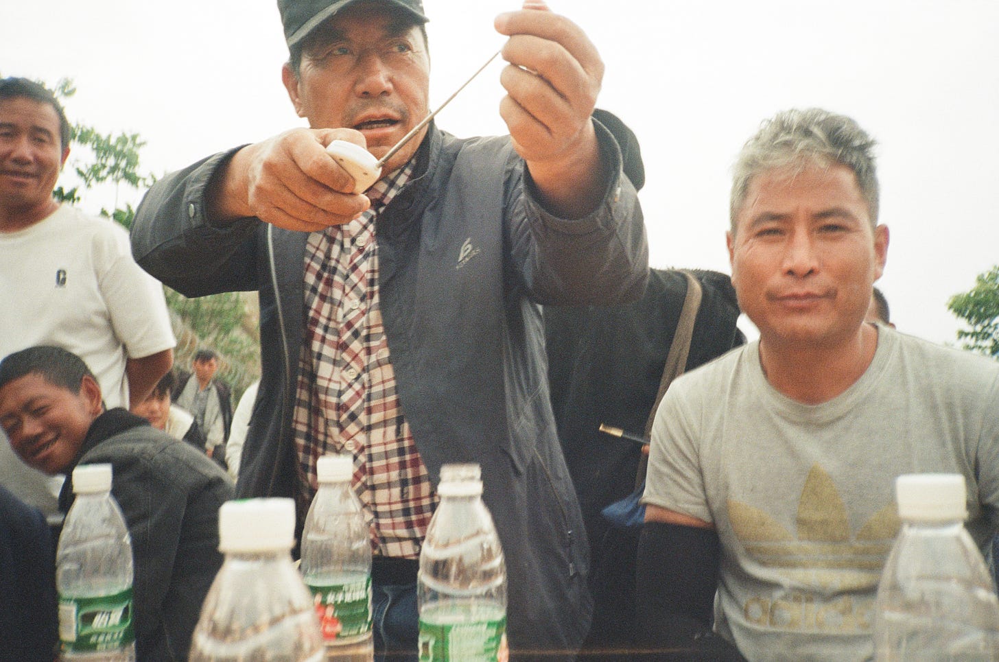 I’d stopped in a mountain pass, trees shrouded in the thickest fog settling through the pines, obscuring small shrines to mountain gods littered in the underbrush. I reach an impasse, a fork in the road. I check my phone. No service. A light rain begins. I stop to ask for directions from a group of farmers. Four couldn’t read the map, two couldn’t speak Chinese, the final man bravely took a look, flipped my phone around a couple times, before offering a shrug. I figured that someone with a car must know how to make it back to a main road. I found a kind family with a white Changan SUV parked outside. They lived in the city but had returned for the holiday and so we shared lunch before they pointed me in the right direction.